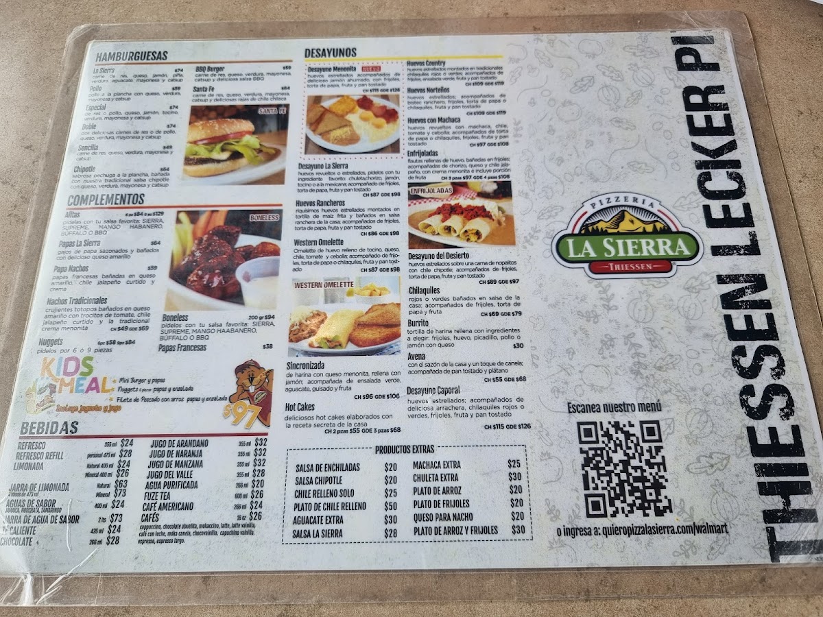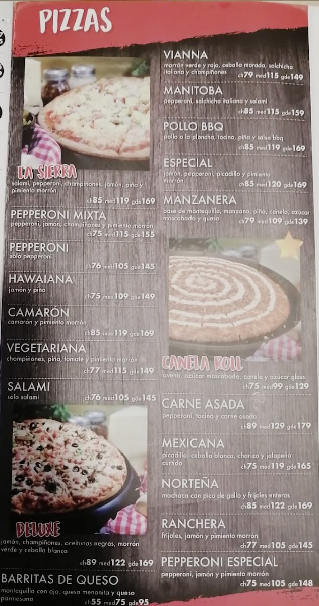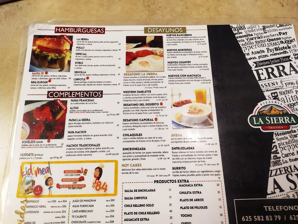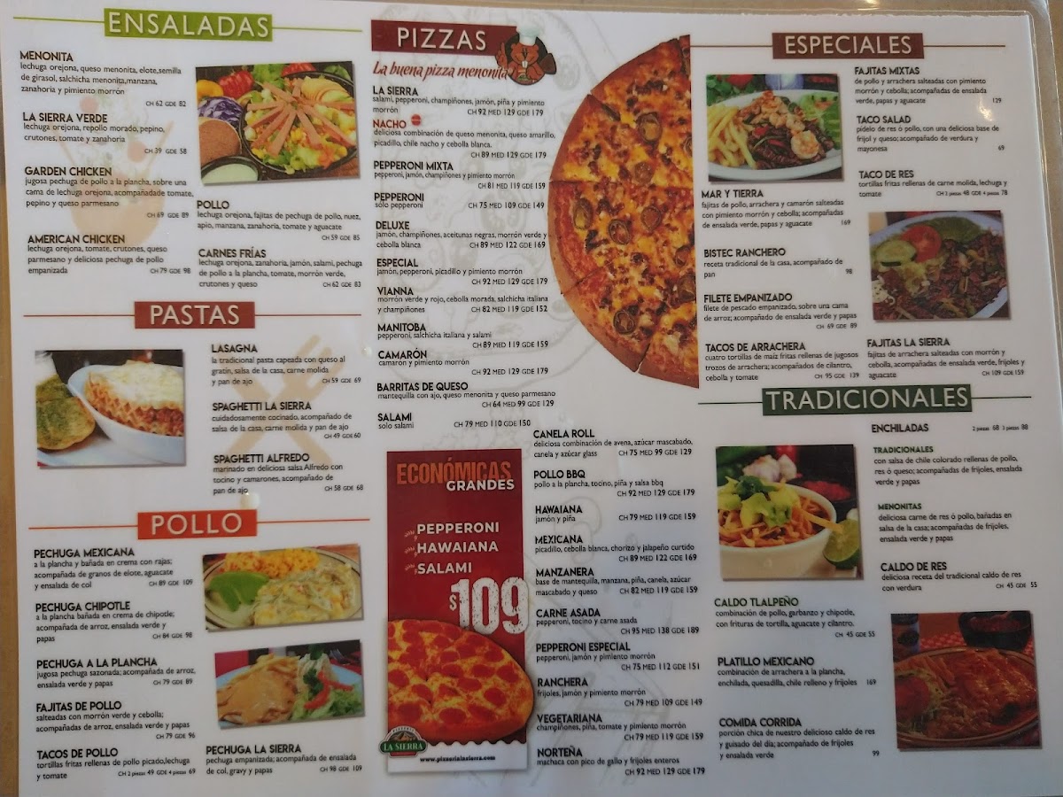 - Signature dishes: La Sierra Pizza, Nacho Pizza, Mennonite Salad.