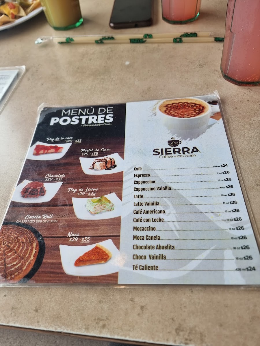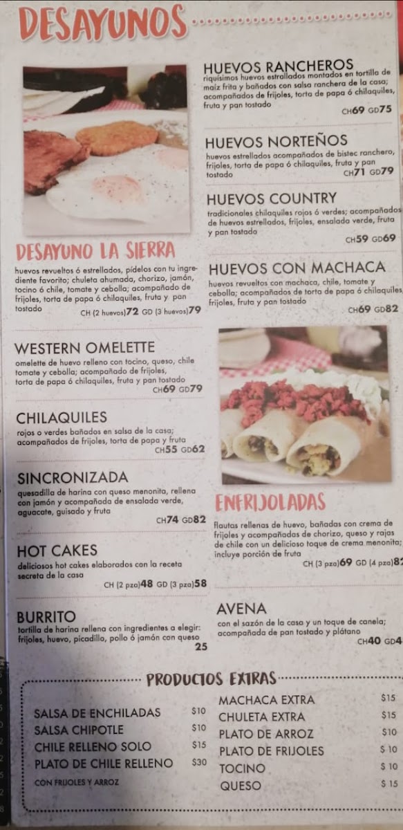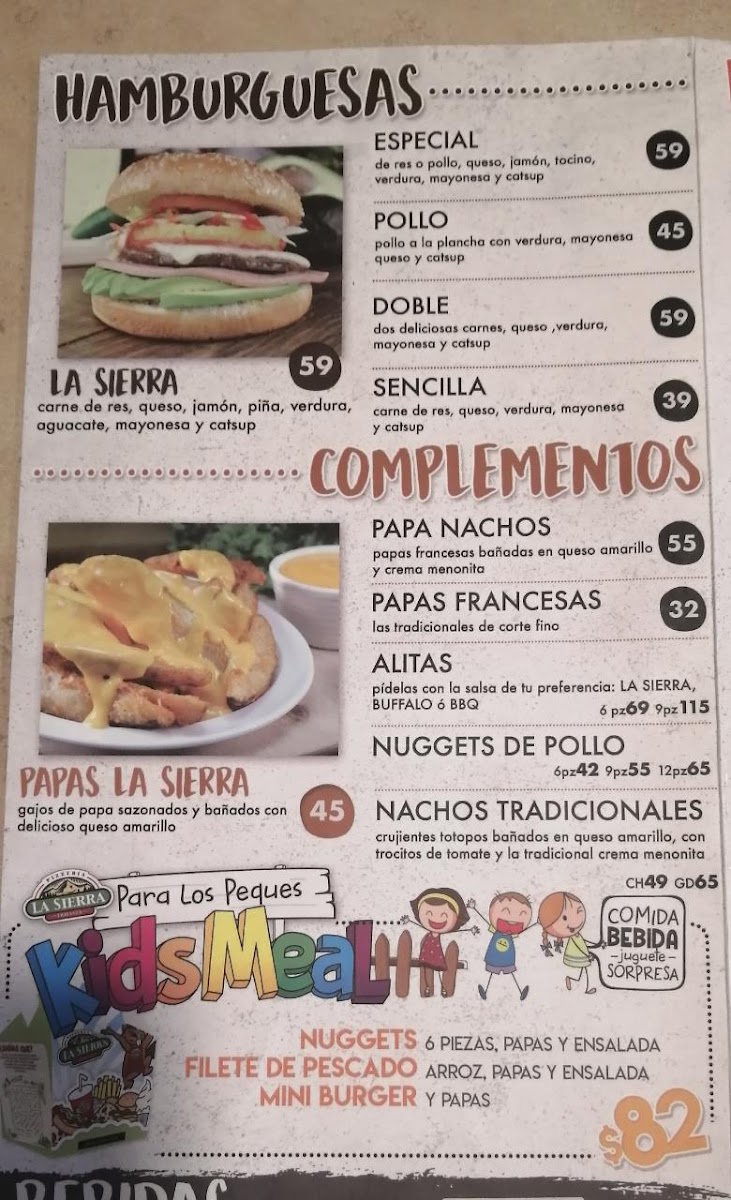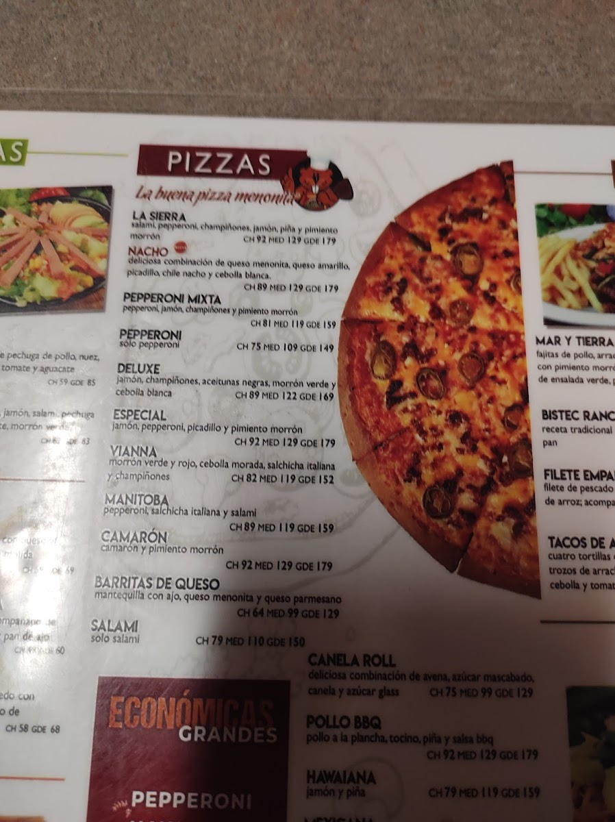 - Signature dishes: La Sierra Pizza, Nacho Pizza, Mennonite Salad.
